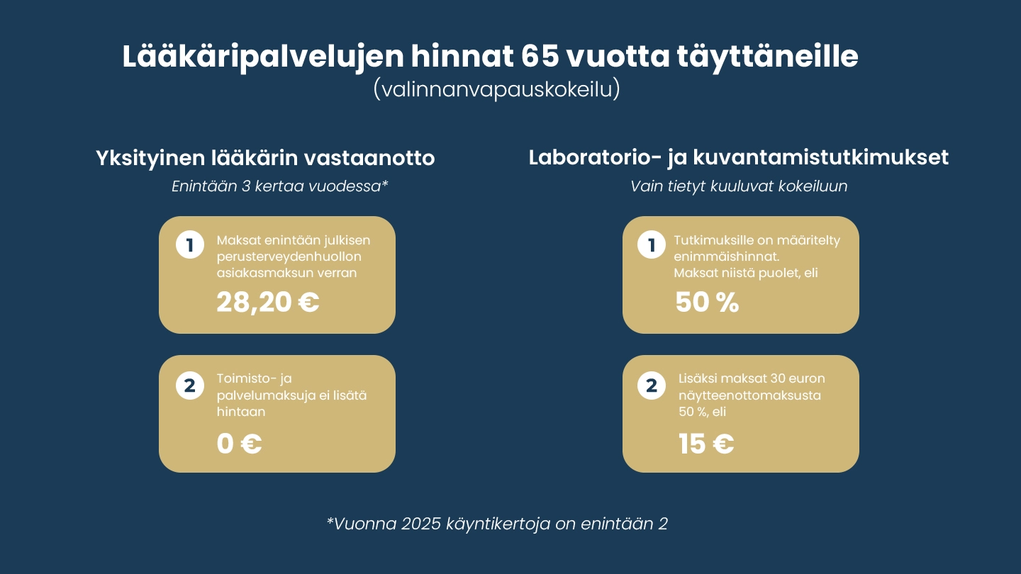 Syyskuusta 2025 alkaen 65 vuotta täyttäneet voivat asioida yksityisellä lääkärillä samaan hintaan kuin julkisessa terveydenhuollossa (noin 28 €). Loppuosa kustannuksista korvataan automaattisesti Kelan toimesta, eikä korvausta tarvitse hakea erikseen.